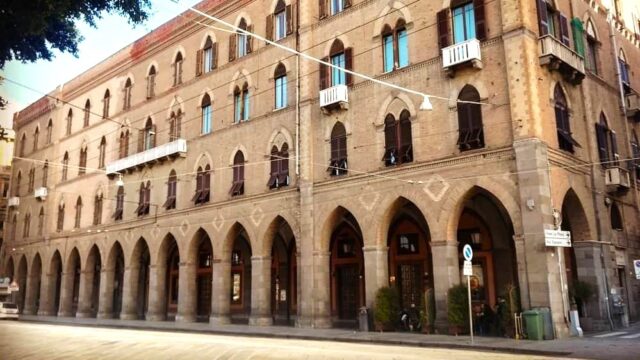 L’edificio ha una pianta a U sviluppata su tre piani, ma è soprattutto la sua facciata ad essere diventata una vera cartolina, incastonata tra la Stazione dei treni e piazza Matteotti. Il rivestimento in cotto a vista e gli elementi decorativi neogotici rubano subito l’occhio, ma è soprattutto quella discrepanza di colori al centro che racchiude una storia nella storia.