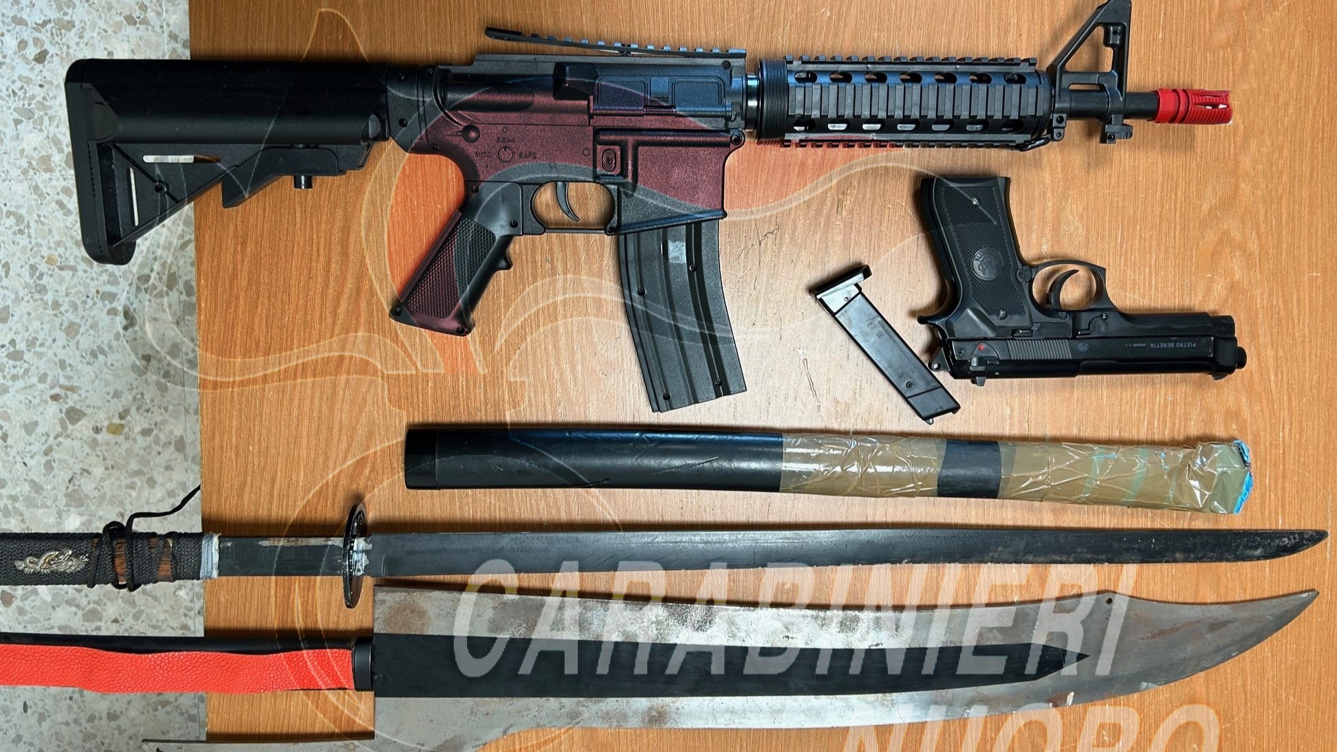 Nel corso dell’attività, i Carabinieri hanno rinvenuto una spada giapponese tipo “katana”, una spada tipo “potens” e diverse armi da softair, fedeli riproduzioni di armi reali ma prive del tappo rosso, elemento obbligatorio per distinguerle da armi autentiche e dimostrarne l’inoffensività.