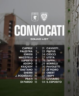 Tra le note positive c’è il ritorno tra i convocati di Zé Pedro, nuovamente a disposizione dell’allenatore rossoblù. Restano invece fuori Marko Rog e Yerry Mina, che continueranno a lavorare al Crai Sport Center. Per il difensore colombiano si tratta di una scelta precauzionale, legata a un sovraccarico funzionale al ginocchio accusato durante la rifinitura mattutina.