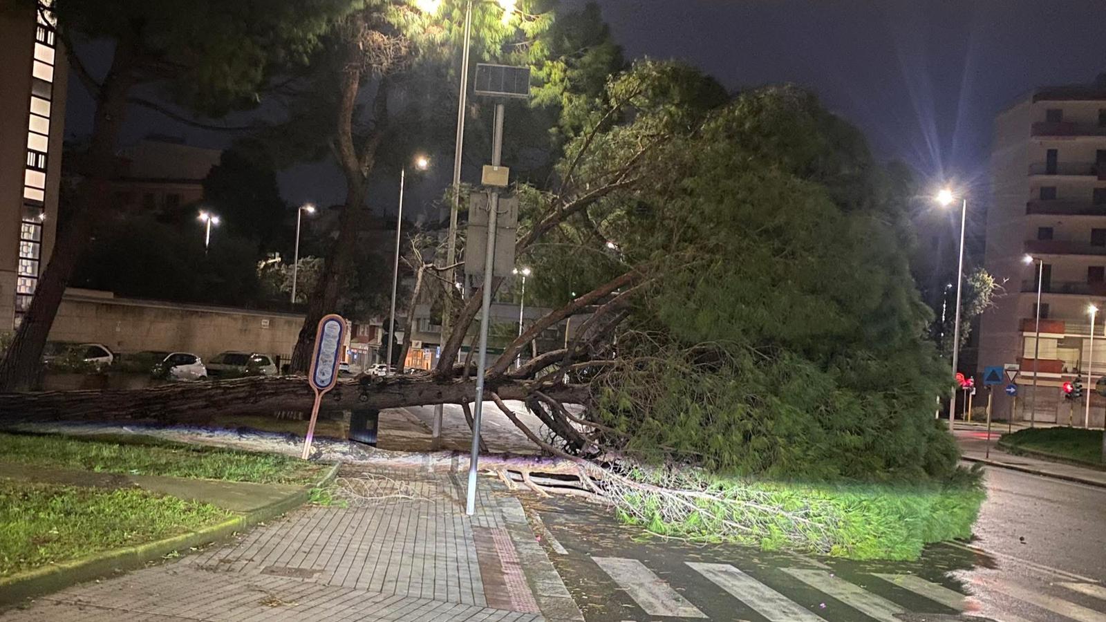 Nel centro abitato di Cagliari si segnalano già i primi danni strutturali al verde pubblico, con diversi episodi di caduta alberi. Una situazione particolarmente critica si è verificata nella zona di piazza Padre Pio, in via dei Conversi: qui, un fusto di grandi dimensioni è stato sradicato dalla forza delle correnti, finendo per abbattersi sul marciapiede e occupando parzialmente la sede stradale.